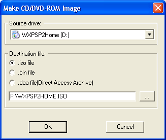 The "Make CD/DVD-ROM Image" dialog will pop up, choose the source drive and destination file type and name, then click OK.