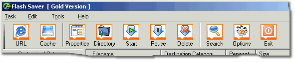 Toolbar Buttons in Main Interface:![]() Toolbar Buttons: -- To detect Flash animations in a URL (http://www.abc.com/) or download a Flash animation with its URL (http://www.abc.com/a-flash.swf) -- To detect Flash animations in local Cache files -- To view the information of the selected Flash file -- To open the directory of the category -- To start/resume downloading the selected Flash file(s) -- To stop downloading the selected Flash files(s) -- To move the selected Flash files to the Recycled category -- To search in all downloaded Flash files -- To modify option settings. The option window will be popup. -- To quit this application |