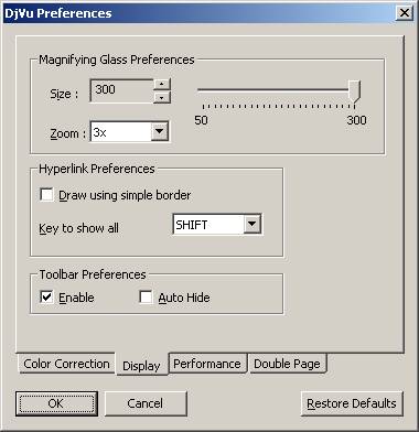 The size of the magnifying glass is given in pixels (the magnified region is square). Zoom is the zoom factor used to magnify the image portion viewed with the magnifying glass. The “hot key” that activates the magnifying glass is either “Control” (default) or "Shift" with the other key being used to "Show All Hyperlinks" (see next entry).