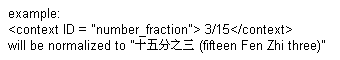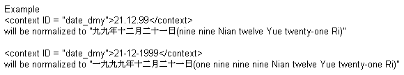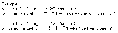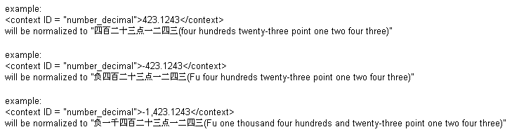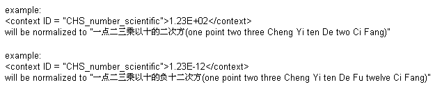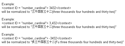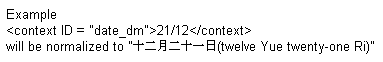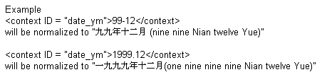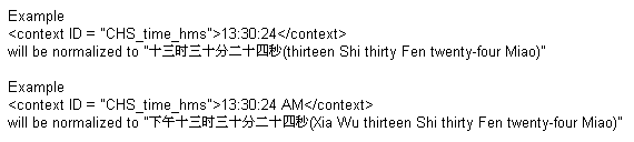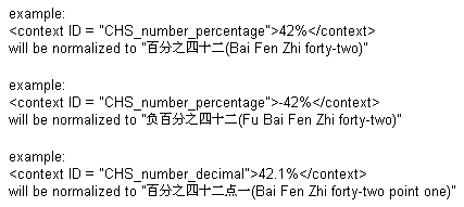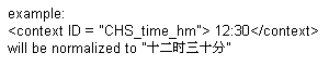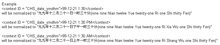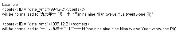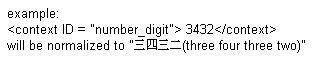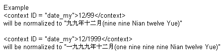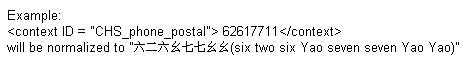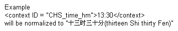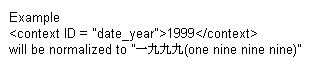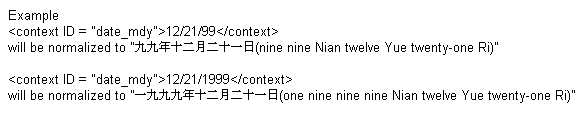 The CONTEXT tag specifies the normalization of a block of text. The context tag ID attribute contains the text string specifying the type of normalization to apply to the text block. The ID attribute of the Chinese engine specific context tags begin with "CHS_". CONTEXT tag ID attribute strings that do not begin with quot;CHS_" use English context text normalization.
